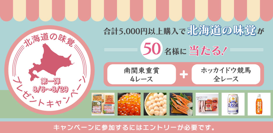 対象レースを合計5,000円以上購入された会員様の中から、 抽選で合計50名様に「北海道の味覚」をプレゼントします。