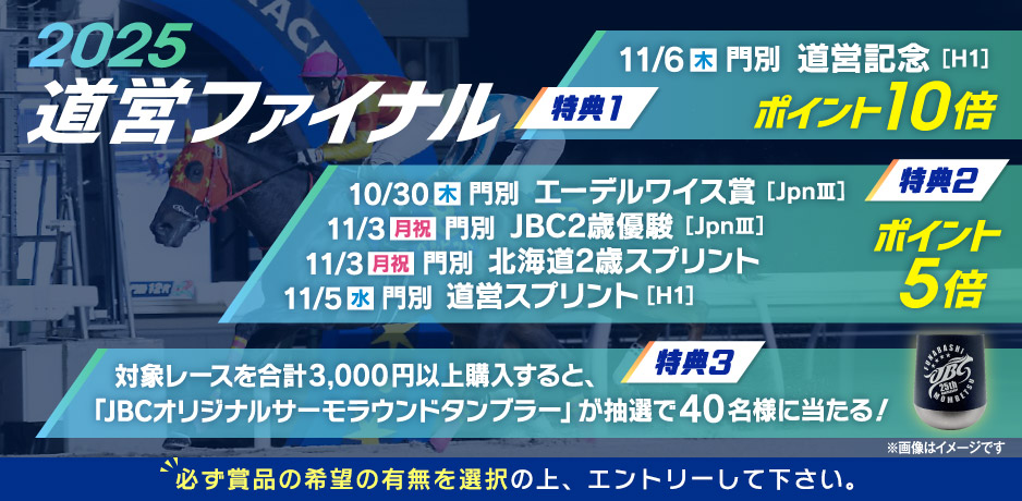 対象レースを合計3,000円以上購入された会員様の中から、 「JBCオリジナルサーモラウンドタンブラー」を抽選で40名様にプレゼントします。