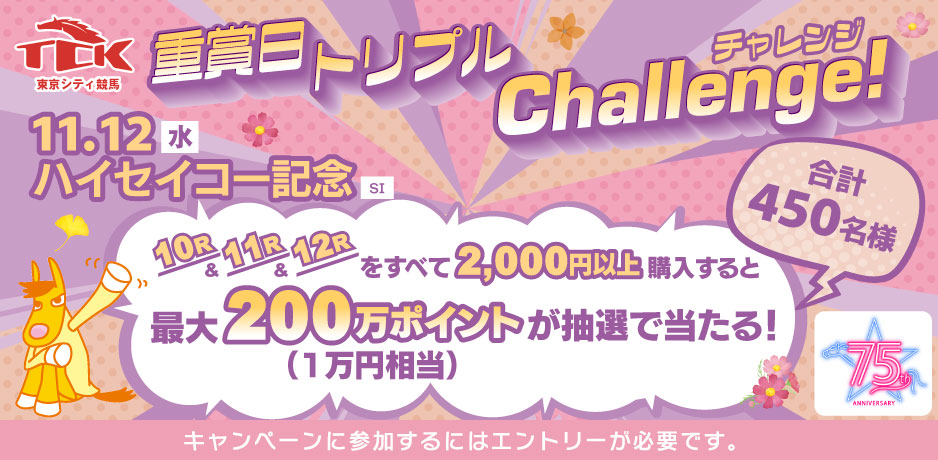 【特典】11/12大井競馬【第10レース~第12レース】をすべて2,000円以上購入すると、 抽選で合計450名様に最大200万ポイントが当たる! |