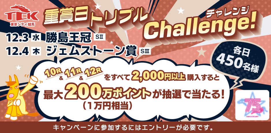 【特典2】12/4大井競馬【第10レース~第12レース】をすべて2,000円以上購入すると、 抽選で合計450名様に最大200万ポイントが当たる! |