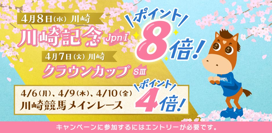【特典2】4/6、4/9、4/10の川崎競馬【メインレース】はポイント4倍!