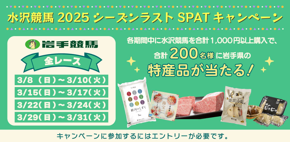 【特典】3/8~3/31水沢競馬を各期間中に合計1,000円以上購入すると、 「岩手県の特産品」が抽選で合計200名様(各期間50名様)に当たる! |